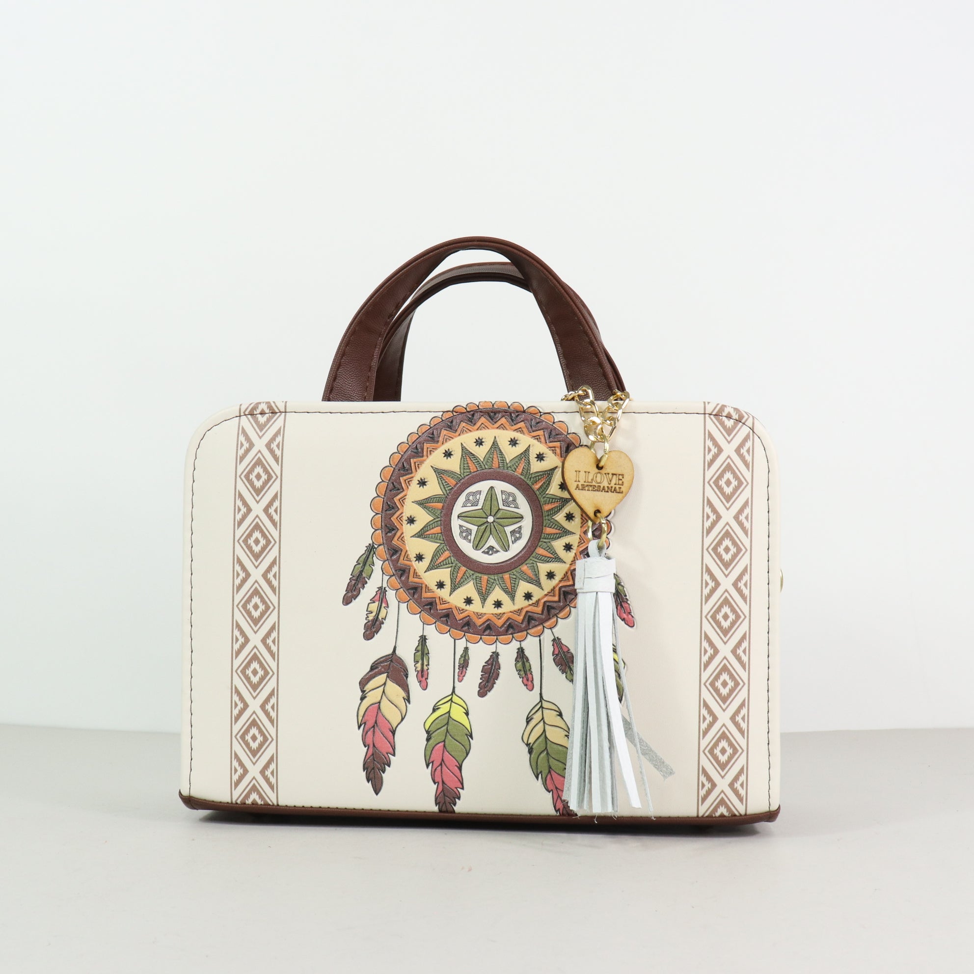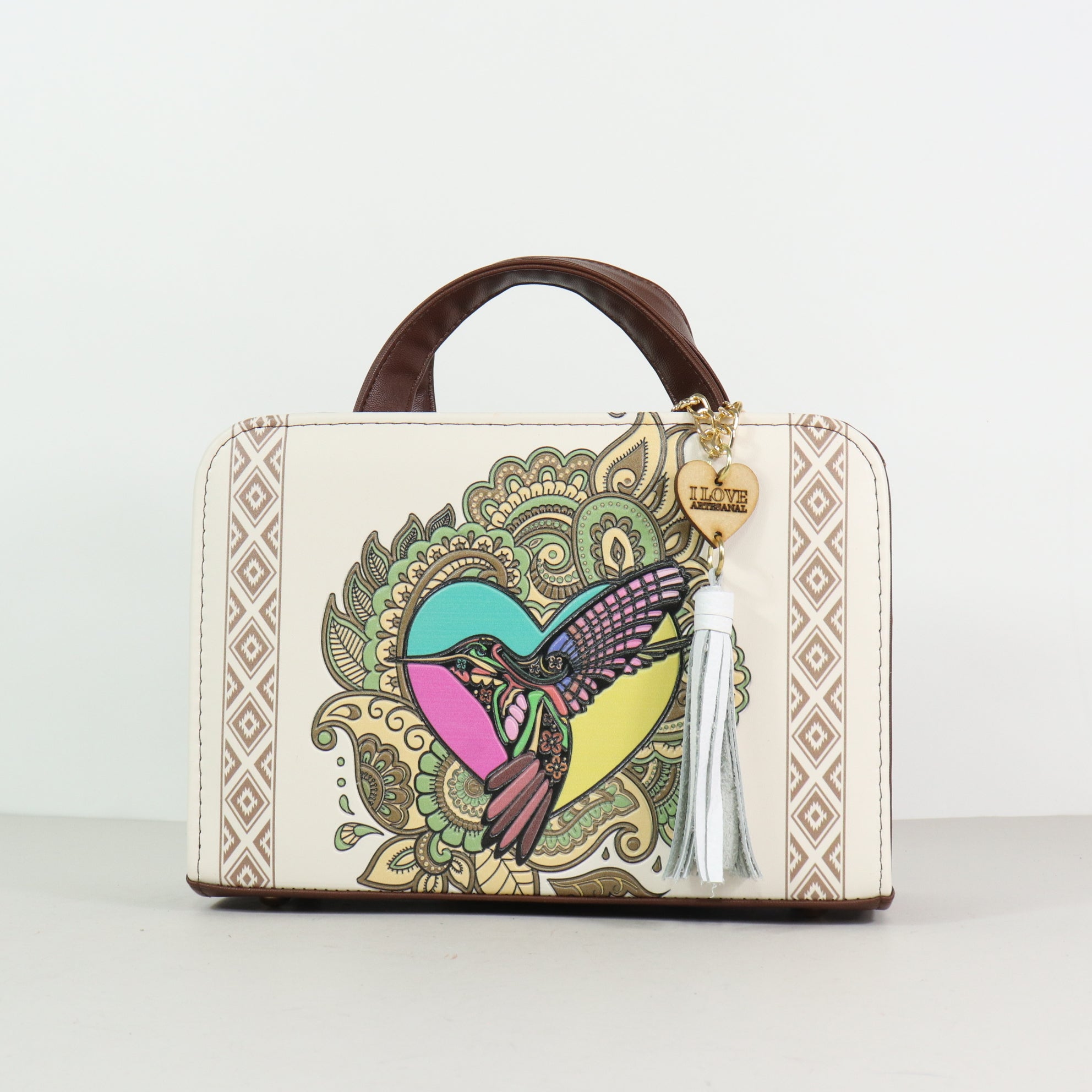 Lleva contigo un símbolo de alegría y vitalidad. El modelo Canvas es un bolso estructurado que fusiona la modernidad del cuero vegano con una ilustración artística de un colibrí en pleno vuelo, enmarcado por patrones geométricos que evocan los textiles tradicionales del sur de México. Su diseño tipo maletín rígido y su asa superior lo convierten en una pieza de alta costura artesanal, perfecta para quienes buscan un accesorio que sea, a la vez, una declaración de estilo y un homenaje a la naturaleza.